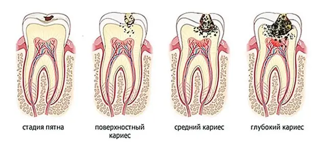 • средний кариес — когда поражающие факторы проникают глубоко в дентин, разрушение зуба становиться хорошо заметным и сопровождается болевыми ощущениями от приема сладкого или кислого. Лечение кариеса заключается в удалении поврежденной части зуба, медикаментозной обработке и наложении пломбы;